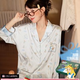 正版联名迪士尼爱丽丝春秋睡衣女长袖柔软冰丝家居服开衫套装