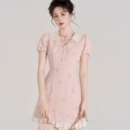 小香风粉色v领短袖连衣裙女夏季高级感蕾丝花边法式小个子甜美裙