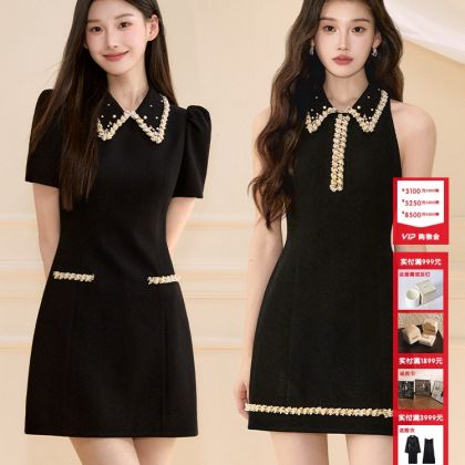 oshea 星耀黑 法式千金风连衣裙女2025新款夏季收腰显瘦重工a字裙 S