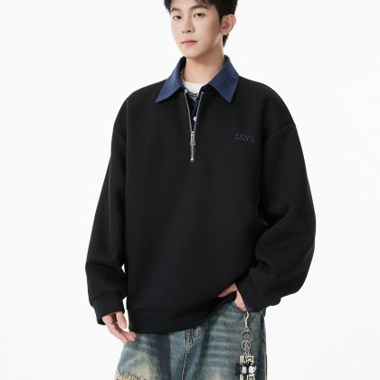 假两件半拉链POLO衫男秋美式撞色学院风卫衣vibe宽松痞帅休闲上衣 黑色 S