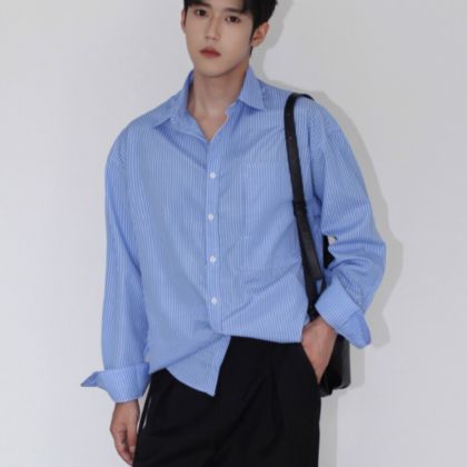 WANGYINXUE简约韩风ins百搭cleanfit宽松口袋条纹休闲长袖衬衫男 蓝色 M